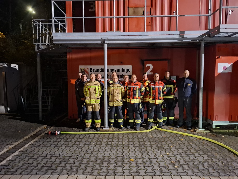 Die Regelausbildung im Brandübungscontainer erstreckt sich über insgesamt drei Stunden, in denen dieTeilnehmer die verschiedensten Szenarien üben. Nach einer Besichtigung der Anlage mit den Ausbildern der BF Nürnberg wurden gemeinsam die Techniken zum Öffnen von Türen sowie der Umgang mit dem Hohlstrahlrohr besprochen. Im Anschluss folgte eine sogenannte „Hitzegewöhnung“. Dabei übten die Teilnehmer den klassischen Löschangriff im Brandeinsatz unter schwerem Atemschutz sowie das Vorgehen während eines „Flashovers“.Die Teilnehmer kamen zu dem Schluss, dass Fortbildungen mit Heißausbildung ein wichtiger Bestandteil unserer Einsatzvorbereitung sind, um im Ernstfall schnell und professionell handeln zu können. Vielen Dank für den offenen Austausch und die Beantwortung der zahlreichen Fragen auf anschauliche und praxisnahe Weise.