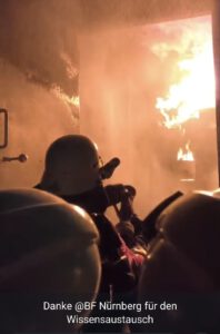 Die Regelausbildung im Brandübungscontainer erstreckt sich über insgesamt drei Stunden, in denen dieTeilnehmer die verschiedensten Szenarien üben. Nach einer Besichtigung der Anlage mit den Ausbildern der BF Nürnberg wurden gemeinsam die Techniken zum Öffnen von Türen sowie der Umgang mit dem Hohlstrahlrohr besprochen. Im Anschluss folgte eine sogenannte „Hitzegewöhnung“. Dabei übten die Teilnehmer den klassischen Löschangriff im Brandeinsatz unter schwerem Atemschutz sowie das Vorgehen während eines „Flashovers“.Die Teilnehmer kamen zu dem Schluss, dass Fortbildungen mit Heißausbildung ein wichtiger Bestandteil unserer Einsatzvorbereitung sind, um im Ernstfall schnell und professionell handeln zu können. Vielen Dank für den offenen Austausch und die Beantwortung der zahlreichen Fragen auf anschauliche und praxisnahe Weise.