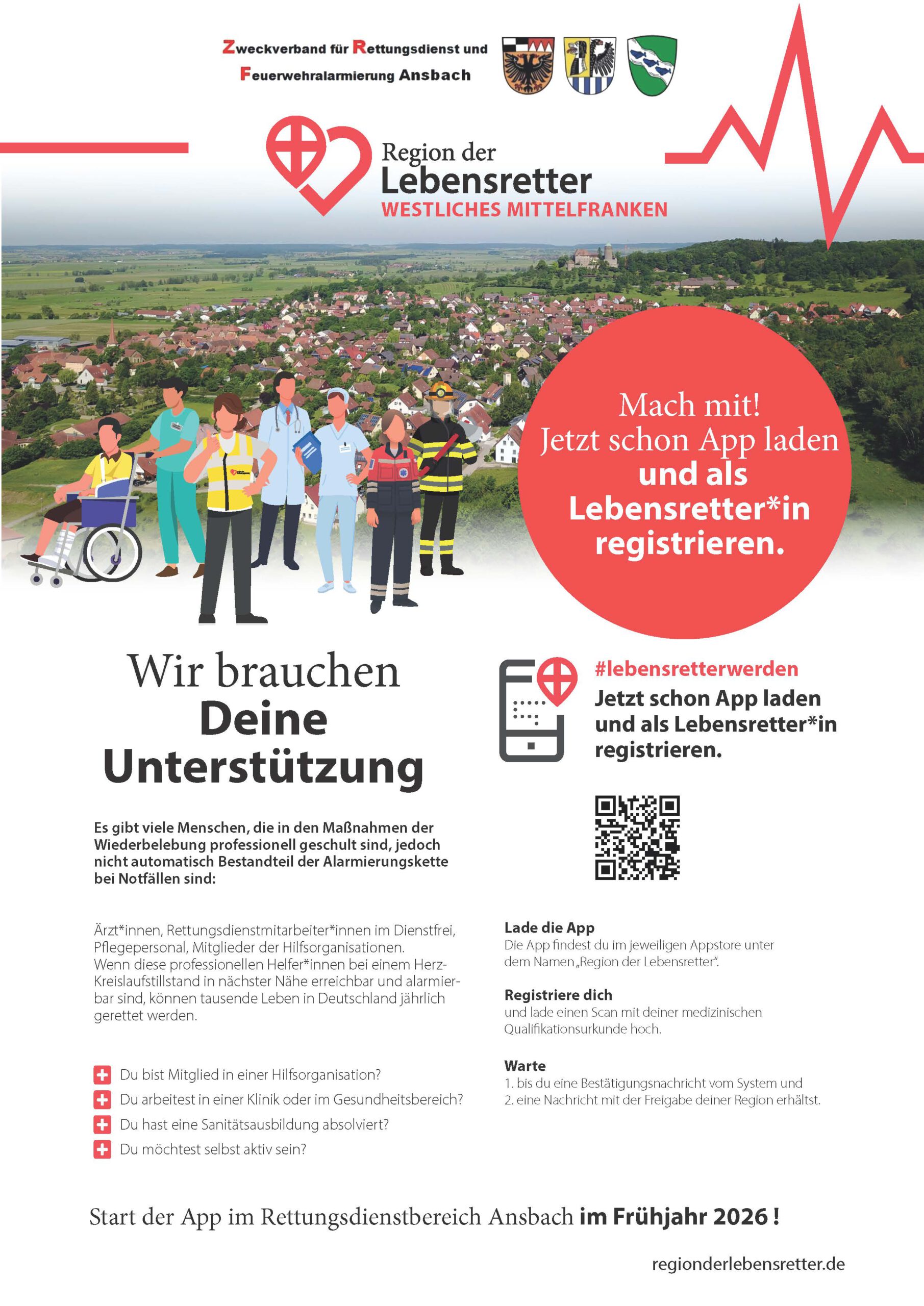 Bei einem Herzstillstand zählt jede Sekunde. Mit der App „Region der Lebensretter” wird im Rettungsdienstbereich Ansbach ein etabliertes System eingeführt. Dieses alarmiert qualifizierte und registrierte Ersthelferinnen und Ersthelfer über ihr Smartphone, wenn ein Notfall in ihrer Nähe eintritt. Träger des Projekts ist der Zweckverband für Rettungsdienst und Feuerwehralarmierung (ZRF) Ansbach. Der Start ist für das Frühjahr 2026 geplant. „Die ‚Region der Lebensretter‘ ist eine wertvolle Ergänzung unserer Rettungskette.