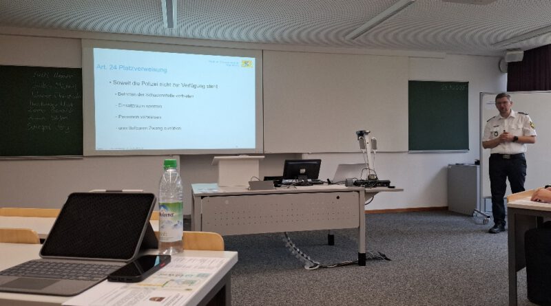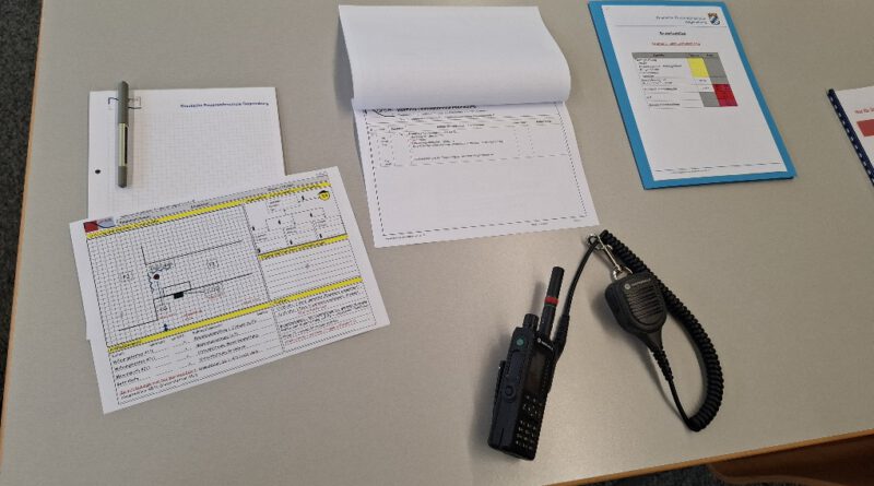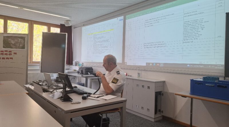 Bei der Tagesschulung startete nach der Begrüßung und einer kurzen Einweisung in die Räumlichkeiten der Lehrgang mit einem Theorieblock, wobei der Schwerpunkt auf der praktischen Übung in der Führungsstufe „C“ unterhalb der Katastrophenschutzleitung lag. Anschließend galt es für beide Gruppen den Stabsraum vorzubereiten und die Abstimmungen für die Besetzung der Einsatzleitung zu treffen. Die Aufgaben des Lagekartenführers und des Fernmelders wurden durch die Mitglieder der UG-ÖEL abgedeckt. Nach der Mittagspause starteten die beiden Gruppen parallel in die Übung. Die Ausgangslage war ein Großbrand im Sägewerk der Firma Rettenmeier. Das Szenario beinhaltete ein Feuer an einer Maschine mit starker Rauchentwicklung und drei vermissten Mitarbeitern. Die ersteintreffenden Feuerwehren konzentrierten sich auf die Personenrettung und Brandbekämpfung. Die Stabsarbeit verlangte den Einsatz von vielen verschiedenen Hilfsmitteln. Es waren taktische Zeichen, Beamer, Drohnenbilder und vieles mehr vorhanden, um die Übung möglichst realistisch darzustellen. Durch immer neue eingespielte Ereignisse wie zum Beispiel eine Verpuffung im Fertigungsbereich, wurde die Einsatzleitung gefordert, mit Nachforderungen und weiteren Maßnahmen zu reagieren. Eine Lagebesprechung mit allen Einheiten (Polizei, THW, Rettungsdienst, Betriebsfeuerwehr und Abschnittsleitern) konnte sehr realistisch nachgestellt werden. Hier ging es darum, kurz und prägnant alle Informationen abzugleichen und ggf. neue Maßnahmen zu beschließen. Nach dem Übungsende fand eine Abschlussbesprechung mit Verbesserungsvorschlägen von den Ausbildern der Feuerwehrschule statt, um den Lerneffekt zu verstärken.